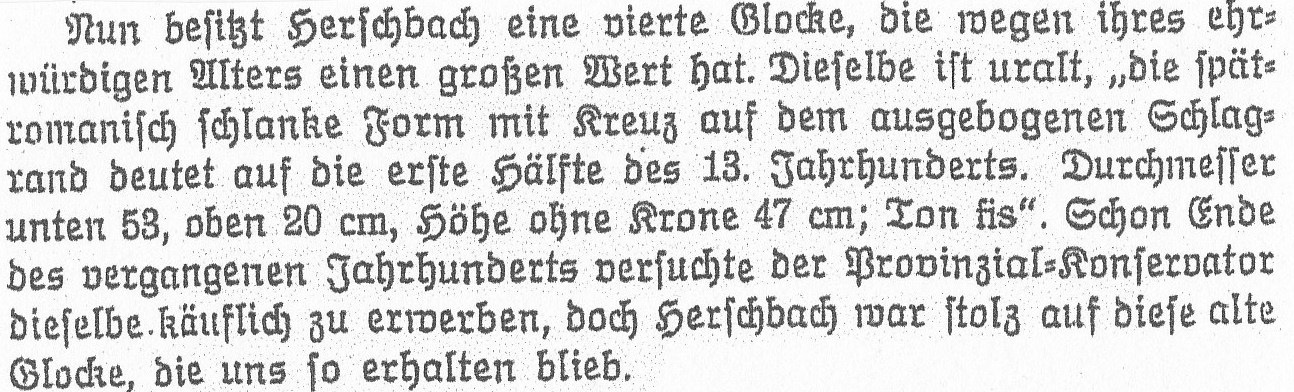 Herschbach besitzt eine Glocke aus der der ersten Hälfte des 13. Jahrhunderts, also aus den Jahren 1201 - 1250. Es ist vielleicht die älteste Glocke der Eifel. Es war das Zeitalter der Mongolen unter Dschingis Khan und der Kreuzzüge, genauer, des vierten Kreuzzuges. Auf ihrer Kleidung trugen die Ritter damals das s. g. Kruckenkreuz, wie es auch auf unserer Glocke zu finden ist. Es heißt so, wegen dem Querbalken an den Enden, die an eine Krücke erinnern. Wegen des Kreuzes bekamen die Kreuzritter ihren Namen. Sie bereisten damals viele Länder, wie Spanien, Portugal, Italien und der Nahe Osten sowie Nordafrika, um sich gegen die Vertreibung der Christen durch die zunehmende islamische Expansion zu Wehr zu setzen. Wie und warum diese Glocke letztlich nach Herschbach kam, ist nicht überliefert.